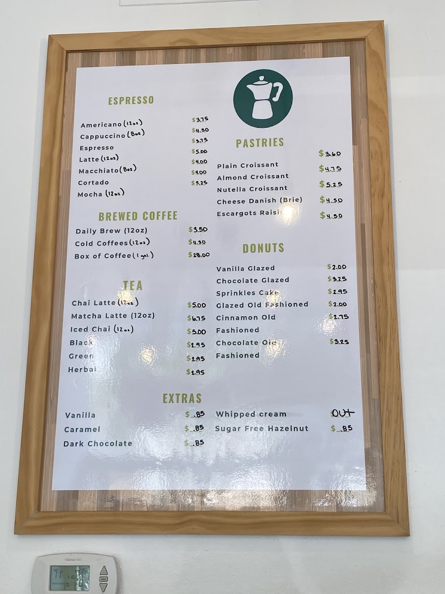 The selection includes classic favorites like lattes, cappuccinos, and cortados alongside refreshing cold brews and the occasional matcha latte for something a bit different. Accompanying the drinks, you’ll find freshly baked pastries such as buttery croissants in plain, almond, or indulgent Nutella varieties, plus rich cheese danishes and sweet escargot raisin rolls. For those seeking a smaller treat, a range of donuts adds a playful touch to the menu.
